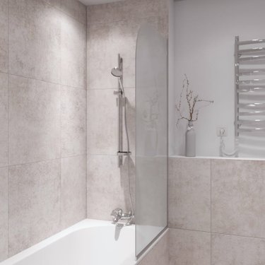 На полу ванной комнаты — керамическая плитка в декоре под дерево. На стенах – белая матовая плитка Tubadzin (Польша), размер 30×60 см.